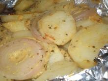 | Potatoes And Onions On The Grill Recipe butter, olive oil, pepper, potato, onion, salt Great way to grill new potatoes and onion Scrub 4 medium size new potatoes with scins left on poke holes in potatoes and microwave for 5 minuets use two sheets of wide, heavy-duty tin foil, layer th...