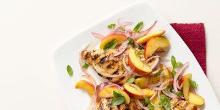 | Grilled Chicken with Nectarine, Red Onion, and Basil Relish - Easy Chicken Recipes chicken breast, red onion, olive oil, pepper, basil, nectarine, peach, white wine vinegar, salt Sweet stone fruit and fresh basil make for a light and summery main when spooned over simple grilled chicken. Heat grill to medium-high. Clean the grill and lightly oil. In a medium bowl, whisk togeth...