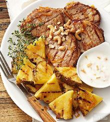 | Grilled Pork and Pineapple cashew, thyme, pepper, pineapple, pork, orange marmalade, salt, yogurt (plain) Grilled pineapple is an ideal sweet side for savory pork loin chops. Trim fat from pork chops. Sprinkle all sides of the chops with salt and pepper. Cut pineapple crosswise into 1/2-inch-thick slices;...