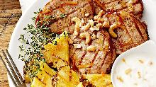 | Grilled Pork and Pineapple pork loin, cashew, pepper, pineapple, orange marmalade, salt, yogurt (plain) This super fast dinner is ready in 18 minutes. The grilled chops are livened up with a sweet and slightly tart sauce of yogurt and orange marmalade. Sprinkle pork lightly with salt and pepper. Cut pin...
