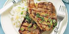 | Asian Grilled Pork Recipe | MyRecipes pork chop, oil, dried ginger, spring onion, garlic, soy sauce, honey, lime juice Marinate center-cut pork chops in a mixture of soy sauce, honey, lime juice and ginger to get quick and easy Asian flavor. Instructions Checklist Step 1 Combine soy sauce, oil, honey, lime juice, gi...