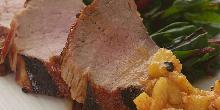 | Grilled Pork Tenderloin With Peach Salsa Recipe | CDKitchen.com pork loin, red onion, pepper, mint, coriander seed, jalapeno, cayenne pepper, cumin, peach, salt, brown sugar, lime juice Savory pork tenderloin plays perfectly with fresh, bright salsa. Mint and jalapeno in the salsa add in a real zing that's counterbalanced by the sweet and spicy pork rub. A winner on both accounts...