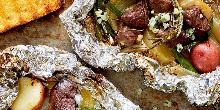 | Steak & Potato Grill Packets with Blue Cheese & Rosemary Recipe | EatingWell beef sirloin steak, red potato, blue cheese, olive oil, rosemary, pepper, onion, garlic, green beans, salt Steak and potatoes are a classic combo on the grill. We have taken the concept one step further by adding green beans and rosemary, and wrapping everything in a packet to make a complete meal. A sprin...
