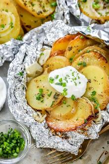 | Grilled Potato Packet Recipe | SparkRecipes butter, red potato, olive oil, onion, garlic Great and Easy Tin Foil Packet Recipe for potatoes on the grill or in the oven Slice up potato - leave skin on, chop onion, chop garlic, and place all in center of a 14" tin foil square. Add oliv...