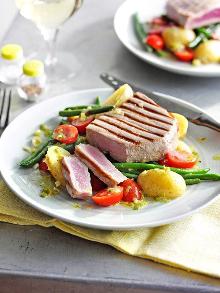 | Grilled Tuna Recipe with Potato and Bean Salad | olivemagazine olive oil, potato, spring onion, green beans, tomato, tuna, mustard, white wine vinegar Try our grilled tuna recipe with potato and bean salad. This tuna steak recipe idea is an easy tuna fish recipe with potato salad. Cook our chargrilled tuna STEP 1 Bring a pan of salted water to the ...