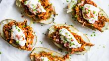 Grilled BBQ Potato Skins Recipe - Food.com butter, chives, potato, garlic, bacon, pork, barbecue sauce, cheddar cheese, sour cream Recipe from Food Network - The Neelys. Sounds like a winner for game day or anytime you are in the mood for BBQ and potatoes. The recipe for the pulled pork is probably out there on Food Network; howe...