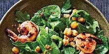 Crispy Chickpea Salad with Grilled Prawns Recipe | MyRecipes red pepper, lemon peel, olive oil, canola oil, cooking spray, pepper, parsley, mint, chickpea, spring onion, garlic, spinach, garden rocket, shrimp, salt, lemon juice Too cold to grill? Broil the shrimp skewers, or cook them on the stovetop in a grill pan. Instructions Checklist Step 1 Combine 1 tablespoon olive oil, 1 1/2 teaspoons lemon rind, 1 tablespoon juice...