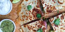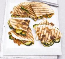 | Grilled courgette, bean & cheese quesadilla recipe | BBC Good Food tomato paste, olive oil, coriander, green chili, cumin, pinto bean, onion, garlic, zucchini/courgette, cheddar cheese, tortilla For a tasty Mexican-style supper, fold up some tortilla pockets and cram with veggies, pinto beans and oozing melted cheddar, from BBC Good Food. STEP 1 Fry the onion in half the olive oil for about...