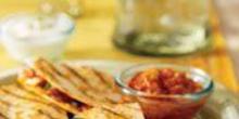 | Spicy Grilled Quesadillas - Campbell's Kitchen chicken, oil, spring onion, salsa, cheddar cheese, tortilla, sour cream Tender chicken, green onion, salsa and Cheddar cheese are sandwiched in flour tortillas that are grilled until golden and delicious. Top each of 4 tortillas with 1/2 cup cheese, 1/4 cup salsa, 1/4 cup...