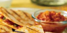 | Grilled Chicken Quesadilla Recipe | SparkRecipes chicken, red onion, olive oil, pepper, coriander leaf, jalapeno, aubergine/eggplant, salt, monterey jack cheese, cheddar cheese, tortilla, lime juice, sour cream, yogurt (plain), water Easy, delicious and healthy Grilled Chicken Quesadilla recipe from SparkRecipes. See our top-rated recipes for Grilled Chicken Quesadilla. Combine 1/4 cup water, cilantro, sliced jalapeno, lime juice ...