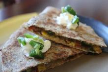 | Grilled Chicken and Vegetable Quesadillas Recipe | MyRecipes chicken breast, yellow/orange bell pepper, cooking spray, pepper, paprika, oregano, cumin, dried garlic, onion, salt, monterey jack cheese, tortilla, sour cream Grilled Chicken and Vegetable Quesadillas are a family favorite and table-ready in only 40 minutes. For spicier quesadillas, add a grilled jalapeno to the veggie mix. Instructions Checklist Step 1 P...