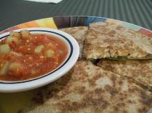 | Grilled Mushroom and Spinach Quesadillas Recipe – Easy Mexican Recipes muenster cheese, olive oil, pepper, coriander leaf, avocado, portobello mushroom, tomato, spinach, salt, tortilla, lemon juice, sour cream Heat grill to medium. In a medium bowl, combine the tomatoes, avocado, lemon juice, 1 tablespoon oil and 1/4 teaspoon each salt and pepper; fold in the cilantro. Set aside. Place the tortillas on a l...