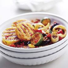 | Grilled Ratatouille Nicoise Recipe | Martha Stewart ribs, red onion, yellow/orange bell pepper, red bell pepper, olive oil, oil, pepper, parsley, garlic, zucchini/courgette, tomato, aubergine/eggplant, sherry vinegar, salt A medley of vegetables enlivens this vegetarian side dish. Roasted plum tomatoes provide a splash of color; grilled eggplant and zucchini add smokiness. The other vegetables in the mix -- onions, red ...