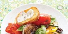 Grilled Ratatouille Salad - Salad Recipes red onion, yellow/orange bell pepper, red bell pepper, goat's cheese, olive oil, oil, pepper, basil, olive, zucchini/courgette, tomato, aubergine/eggplant, salt, mozzarella cheese, bread This colorful salad is a breeze to make thanks to your trusty backyard BBQ Slice the top off each pepper and discard; cut the rest of each pepper into 4 horizontal slices, discarding seeds. Trim zucch...