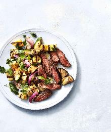 | Grilled Skirt Steak With Squash Ratatouille Recipe | Real Simple beef skirt steak, red onion, olive oil, pepper, parsley, yellow squash, zucchini/courgette, aubergine/eggplant, balsamic vinegar, salt Get the recipe for Grilled Skirt Steak With Squash Ratatouille. Instructions Checklist Step 1 Preheat a large grill pan over high. Rub steak with 1 tablespoon oil and 1 teaspoon each salt and pepper...