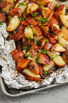 | Grilled Red Potatoes Recipe | SparkRecipes butter, red potato, pepper, onion, garlic, salt Serves 2 (4 potatoes each) Quarter potatoes and put on a large sheet of foil. Dot packet with butter, onion and garlic. Sprinkle with salt & pepper. Close packet by crimping ends and top. Cook on ...