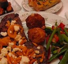 | Peppered Rib Eye Steaks With Grilled Sweet Peppers Recipe - Food.com beef ribeye steak, yellow/orange bell pepper, red bell pepper, olive oil, thyme, pepper, paprika, oregano, cayenne pepper, dried garlic, basil, balsamic vinegar, salt, seasoning UMMM... When you just gotta have beef! Prep time includes 1 hour chill time. Serving Size: 1 (245) g Servings Per Recipe: 8 AMT. PER SERVING % DAILY VALUE Calories: 437 Calories from Fat 300 g 69 ...