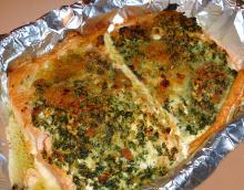 | Grilled Salmon Recipe - Food.com butter, olive oil, parsley, dill, garlic, salmon, salt, bread crumbs, vegetable fat spread Try Grilled Salmon from Food.com. - 7760 Serving Size: 1 (247) g Servings Per Recipe: 6 AMT. PER SERVING % DAILY VALUE Calories: 665.8 Calories from Fat 427 g 64 % Total Fat 47.5 g 73 % Saturate...