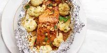 | Spicy Grilled Salmon red pepper, hoisin sauce, oil, peanut, coriander, cauliflower, salmon, salt With a little tinfoil, this fancy meal can be made right on the grill. Step 1 Place salmon in centers of 4 foil sheets. Brush each with 1 tablespoon hoisin sauce; sprinkle each with 1/8 teaspoon crush...