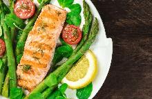 | Grilled Salmon with Peaches Recipe red onion, quinoa, snap/snow peas, red peppercorn, mint, cayenne pepper, peach, salmon, sherry vinegar Cooking salmon on the coals is a delicious way to get heart-healthy omega-3s. Nutty-tasting quinoa and peaches deliver additional flavor and fiber. Prepare outdoor grill for covered direct grilling on...