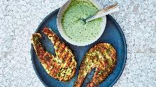 | Grilled Salmon Steaks with Garlicky Yogurt Sauce Recipe | Bon Appetit olive oil, oil, coriander leaf, chili pepper, garlic, salmon, salt, honey, milk, yogurt (plain) A grilled salmon recipe that’s sure to please. The yogurt sauce on top will work on virtually any protein you can think of. Even tofu. Yeah, we went there. Step 1 Prepare a grill for medium-hig...