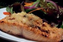 | Grilled Salmon Steaks Recipe by American.Gourmet | ifood.tv pepper, parsley, mustard powder, onion, salmon, salt, lemon juice GETTING READY 1. Thaw fish if frozen. 2. In a small bowl, mix together oil, parsley, lemon juice, onion, mustard, salt and pepper to prepare marinade. 3. In a shallow dish, place steaks and pour ma...