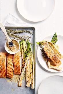 Grilled Salmon & Leeks with Rosemary-Mustard Butter butter, olive oil, rosemary, pepper, leek, salmon, mustard, salt Adding herbs and mustard to butter is a clever way to elevate grilled ingredients. When brushed on the hot food, the butter melts into a rich sauce. Trim dark green tops and root ends from leeks, leav...