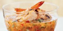 | Grilled Shrimp Cocktail with Yellow Gazpacho Salsa Recipe | EatingWell tomato orange/yellow, red onion, yellow/orange bell pepper, hot sauce, thyme, pepper, chives, garlic, celery, cucumber, shrimp, worcestershire sauce, white wine vinegar, salt, lemon juice Yellow tomatoes have a lower acidity than their red cousins and several varieties are among the earliest in the season to ripen. Here they combine with cool cucumber and yellow bell peppers in a refre...