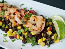 | George Foreman Grilled Shrimp With Southwestern Black Bean Salad Recipe | CDKitchen.com black beans, olive oil, cooking spray, pepper, coriander leaf, jalapeno, cumin, spring onion, garlic, tomato, sweetcorn, shrimp, worcestershire sauce, soy sauce, salt, honey, orange juice, lime juice Shrimp are marinated in a citrus-soy mixture then grilled. Serve on a bed of zesty black bean and corn salad. Can use an indoor grill like George Foreman or a regular outdoor To prepare marinated shri...