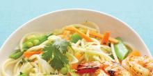 | Grilled Shrimp with Noodles Salad - Shrimp Recipes snap/snow peas, chili paste, oil, pepper, coriander leaf, lime, carrot, spring onion, cabbage, shrimp, apple cider vinegar, salt, rice vinegar, pasta, sugar Snap peas, lime juice and spicy flavoring makes this salad sizzle. Adapated with permission from Weekend. Soak four 8-inch wooden skewers in water for at least 30 minutes to keep them from burning on ...