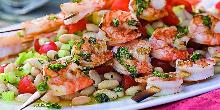 | Grilled Shrimp Skewers over White Bean Salad Recipe | EatingWell cannellini bean, lemon peel, olive oil, sage, pepper, oregano, chives, celery, tomato, shrimp, salt, lemon juice Fresh herbs make all the difference in this light, summery bean salad that in turn makes an aromatic bed for the easy grilled shrimp. The shrimp and salad are wonderful together but you could also mak...