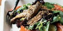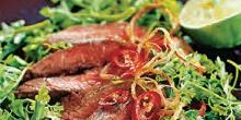 | Grilled Skirt Steak Salad - Salad Recipes - Lunch dressing, beef skirt steak, beef steak, salad, lime peel, peanut oil, olive oil, watercress, chervil, red chili, lime, shallot, mustard, salt, lime juice, flour Skirt steak is an incredibly tasty cut. When paired with tender greens and a citrus dressing, it becomes a main-course salad. To make dressing: In a medium bowl, whisk together shallots, lime peel and...
