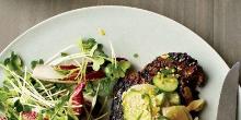 | Grilled Steak with Cucumber and Daikon Salad Recipe beef steak, lemon peel, canola oil, sesame seed, pepper, chili pepper, radish, daikon, garlic, cucumber, garden rocket, soy sauce, salt, rice vinegar, lemon juice Chef David Myers grills with bincho (hard white charcoal) and serves the steak with yuzu kosho, a condiment of yuzu (a citrus), chiles, and salt. Home cooks can use a topping of lemon zest, chile, and...