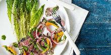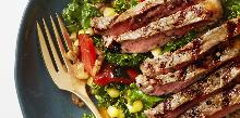 | Grilled Steak Salad beef flank steak, beef sirloin steak, chili dried/powder, olive oil, cooking spray, coriander leaf, coriander, cumin, avocado, shallot, spring onion, garlic, tomato, sweet pepper, sweetcorn, lettuce, salt, honey, lime juice, water Here's a brilliant steak dinner idea: Make the most of a great cut of beef by slicing and serving atop a big bowl of veggies. This well-balanced grilled steak salad recipe makes for a crowd-pleasi...