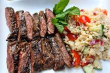 | Grilled Skirt Steak With Orzo Pasta Salad Recipe - Food.com beef skirt steak, orzo pasta, red onion, feta cheese, olive oil, pepper, oregano, mint, tomato, cucumber, balsamic vinegar, red wine vinegar, salt http://www.artofmanliness.com/2011/08/30/skirt-steak-5-different-ways/ Serving Size: 1 (526) g Servings Per Recipe: 4 AMT. PER SERVING % DAILY VALUE Calories: 782.2 Calories from Fat 217 g 28 % T...