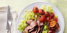 | Best Grilled Steak Salad Recipe beef flank steak, sweet potato, tomato, lettuce, balsamic vinegar, soy sauce, maple syrup Enjoy delicious grilled toppings in this main-dish salad, like grilled steak, grilled tomatoes, and grilled sweet potatoes. Step 1 Prepare outdoor grill for direct grilling on medium-high. In large mi...