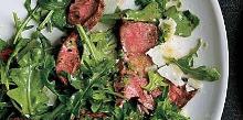 | Grilled Steak with Baby Arugula & Parmesan Salad Recipe | MyRecipes olive oil, thyme, pepper, chives, lemon, garden rocket, mustard, salt, parmesan cheese, lemon juice Flat-iron steaks come from the top blade portion of the chuck or shoulder section. Instructions Checklist Step 1 Heat a grill pan over medium-high heat. Rub thyme, 1/4 teaspoon salt, and 1/4 teaspoo...