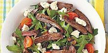 | Pepper-Grilled Steak with Chopped Summer Salad Recipe | Bon Appetit beef sirloin steak, kalamata olive, red onion, feta cheese, olive oil, oil, pepper, jalapeno, garlic, tomato, garden rocket, salt Pepper-Grilled Steak with Chopped Summer Salad Recipe Step 1 Mix garlic, pepper, and 1 1/4 teaspoons coarse salt in small bowl; rub all over steak. Let stand at room temperature 1 hour. Step 2 Spra...