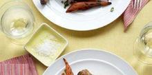 | Grilled sea bream fillets with sweet potato recipe | delicious. magazine pumpkin seeds, red onion, oil, coriander leaf, sweet potato, mustard, yogurt (plain) Got some sea bream fillets? Pair them with sweet potato for a quick and healthy dinner option. Cook the sweet potato in a pan of boiling water for 10-15 minutes until tender. Drain and leave to cool....