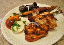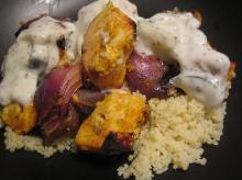 | Grilled Tandoori Chicken and Red Onion Skewers With Couscous Recipe - Food.com chicken thigh, red onion, mixed spice, olive oil, cooking spray, mint, cucumber, salt, cous cous, yogurt (plain) These well-seasoned chicken skewers certainly beat plain grilled chicken. Bottled tandoori spice mix makes prep work a snap (just ease up on the amount if you can't stand too much heat). From W.W....