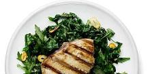 | Grilled Tuna on Braised Arugula Recipe | MyRecipes butter, olive oil, thyme, pepper, peppercorn, shallot, garlic, garden rocket, tuna, white wine vinegar, salt, orange juice, lemon juice Grilled Tuna fillets sit on top of a bed of Braised Arugula. This one-dish meal is rich in vitamin C from the orange-lemon sauce which helps you absorb the iron in the arugula. Instructions Checklist ...