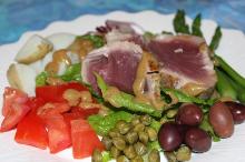 | Grilled Tuna Salad Nicoise | Australia's Best Recipes kalamata olive, olive oil, parsley, caper, basil, potato, garlic, green beans, tomato, lettuce, tuna, anchovy, eggs, mustard, lemon juice A classic French salad updated by grilling the tuna. Whisk together olive oil, lemon juice, mustard and garlic in a small bowl until combined well, then whisk in herbs, capers, anchovy filets, and sal...