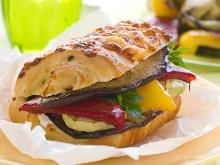 | Grilled-Vegetable Sandwich Recipe | MyRecipes red onion, red bell pepper, pesto, olive oil, pepper, oregano, basil, zucchini/courgette, tomato, aubergine/eggplant, lettuce, white wine vinegar, salt, bread There's plenty of room for experimentation here. We've used grilled eggplant, zucchini, bell peppers, and onion sandwiched in crusty rolls with a little pesto. Fennel, endive, or mushrooms wou...