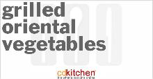 | Grilled Oriental Vegetables Recipe | CDKitchen.com red bell pepper, chili dried/powder, hot sauce, chicken stock, sesame seed oil, ginger root, garlic, zucchini/courgette, soy sauce A recipe for Grilled Oriental Vegetables made with sesame oil, garlic, ginger, crushed red pepper flakes, chili sauce, soy sauce, chicken Heat the sesame oil in small saucepan. Add the minced garlic a...