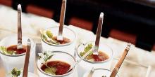 | Grilled-Vegetable Gazpacho Recipe yellow/orange bell pepper, red bell pepper, red pepper, oil, pepper, coriander, cumin, onion, garlic, zucchini/courgette, sweetcorn, cucumber, red wine vinegar, salt, tomato juice, orange juice, lemon juice Classic Andalucian gazpacho combines raw vegetables like tomatoes and onions with red wine vinegar for a little kick. Kerry Simon uses grilled vegetables with a blend of vinegar, orange juice, and lem...