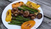 | Grilled Vegetables Recipe - Food.com red onion, yellow/orange pepper, green pepper, red pepper, olive oil, mushrooms, sweet potato, potato, garlic, zucchini/courgette, aubergine/eggplant, balsamic vinegar, seasoning Use whichever vegetables you have on hand or enjoy. Serving Size: 1 (154) g Servings Per Recipe: 4 AMT. PER SERVING % DAILY VALUE Calories: 219.2 Calories from Fat 212 g 97 % Total Fat 23.6 g 36 ...