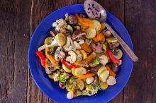 | Grilled Marinated Vegetables Recipe | MyRecipes light soy sauce, red onion, yellow/orange bell pepper, red bell pepper, olive oil, pepper, mushrooms, yellow squash, garlic, zucchini/courgette, salt, lemon juice These veggies are delicious warm off the grill or chilled and served at a later time. Instructions Checklist Step 1 Remove mushroom stems, and discard; cut mushrooms in half. Diagonally slice squash...