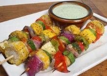 | Grilled Vegetables Recipe - RecipeTips.com red onion, vegetables, olive oil, pepper, parsley, ginger root, coriander leaf, coriander, pattypan squash, spring onion, garlic, zucchini/courgette, tomato, sweetcorn, salt, lime juice, sour cream, yogurt (plain) A tasty cilantro sauce enhances the wonderful grilled flavor of the fresh vegetables in this easy recipe. PREP 15 mins COOK 10 mins READY IN 25 mins Soak 12 wooden skewers in water for one hour....