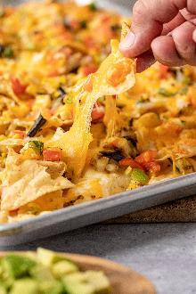| Grilled Vegetable Nachos Recipe red bell pepper, olive oil, pepper, avocado, spring onion, zucchini/courgette, tomato, sweetcorn, aubergine/eggplant, salt, tortilla chips, monterey jack cheese, cheddar cheese, sour cream Healthy summer nachos are easy to assemble. Simply layer store-bought tortilla chips, lots of shredded cheese, and your favorite surplus summer vegetables charred on the grill. Prepare your grill: Pr...