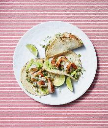 | Shrimp Tacos With Guacamole Cream and Olive Salsa Recipe | Real Simple olive oil, pepper, coriander leaf, jalapeno, avocado, olive, onion, shrimp, salt, tortilla, lime juice Get the recipe for Shrimp Tacos With Guacamole Cream and Olive Salsa. Instructions Checklist Step 1 Scoop the avocado into a blender; add 1 tablespoon of the lime juice and 1 teaspoon salt. Puree un...
